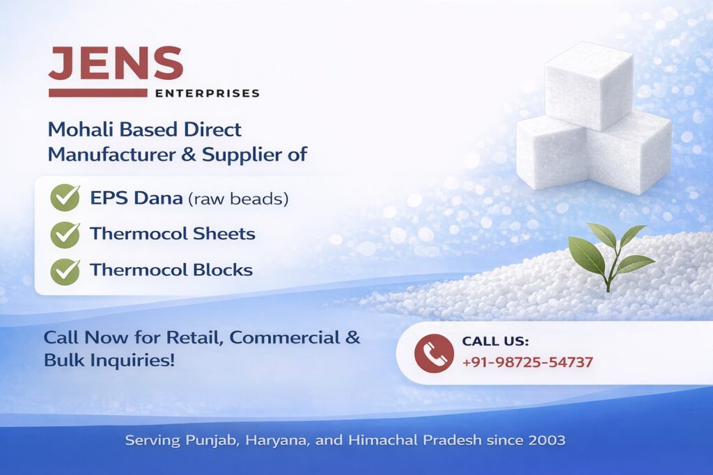 Looking for durable, customized, premium-quality thermocol (EPS) products? Jens Enterprises is a leading manufacturer and supplier of Thermocol Ball, Thermocol Block, and Thermocol Sheet from Mohali, Punjab, India, offering premium-quality EPS products designed for residential, commercial, and industrial needs throughout Punjab, Haryana, and Himachal Pradesh since 2003.